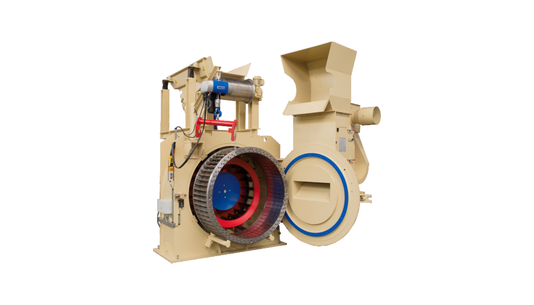 磁輥配有可以調(diào)節(jié)的排料點(diǎn),用來分離出鐵質(zhì)金屬,從上方下來的氣流橫向吹風(fēng),沿著可以調(diào)節(jié)的導(dǎo)流板的方向吹送木片偏離原來的路線,利用一個(gè)渦旋葉片形成的氣流,把木片送到環(huán)式刨片機(jī)內(nèi)部的切削室,物料內(nèi)的雜質(zhì)則落到前面的一個(gè)容器內(nèi)。